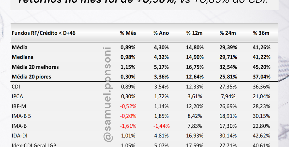 ** Para a análise de fundos de Crédito, recomenda-se olhar retornos de, PELO MENOS, 12 a 24 meses. Fora isso, é EXTREMAMENTE importante se atentar a todos os aspectos qualitativos do fundo e conhecer bem a gestora responsável pela estratégia do produto antes de investir