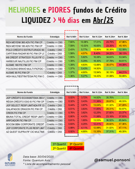 MELHORES E PIORES FUNDOS DE CRÉDITO EM ABRIL 2025 (Prazo superior a 46 dias)