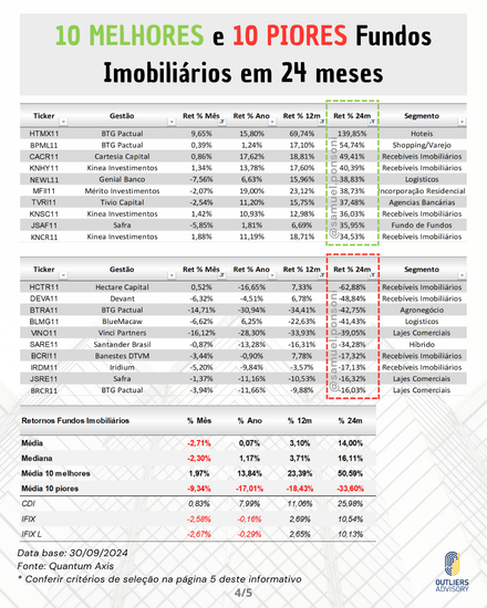 MELHORES E PIORES FUNDOS IMOBILIÁRIOS EM SETEMBRO 2024