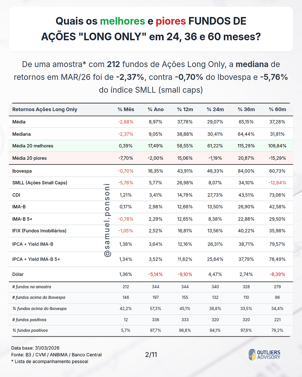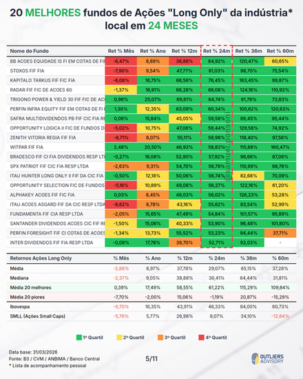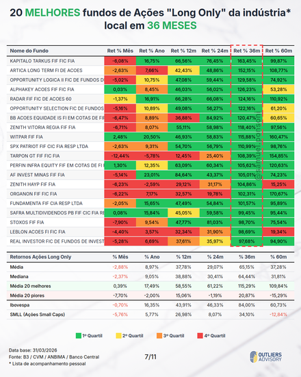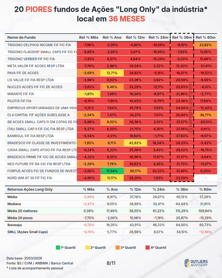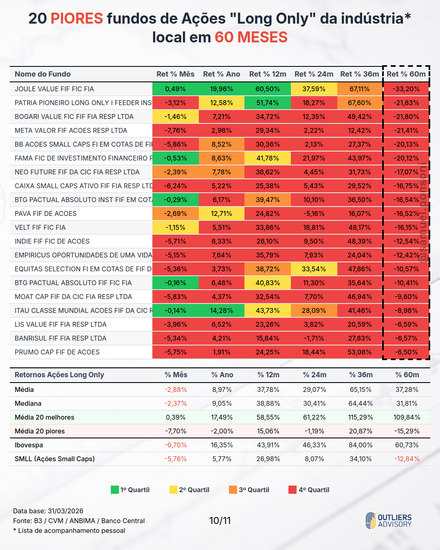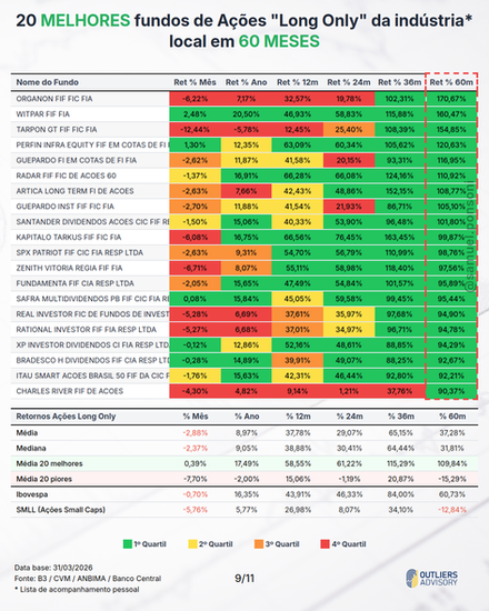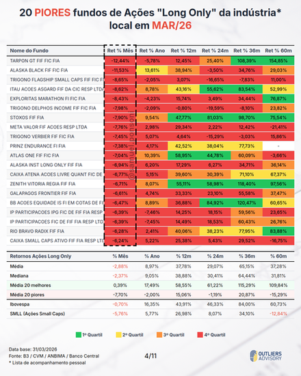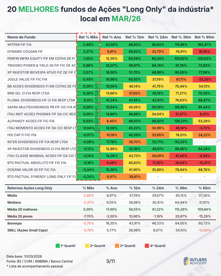 MELHORES E PIORES FUNDOS LONG ONLY EM MARÇO 2026